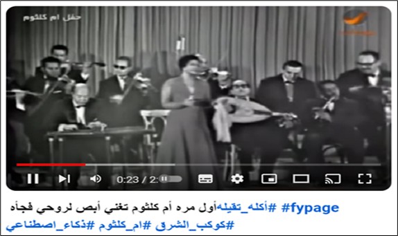 المثال الثاني، يمثل مقطعا من كوبليه ومطلع ولازمة من أغنية معروفة للمغني الشعبي المصري عبد الباسط حمودة تحمل عنوان أنا مش عارفني (صورة رقم 2). القراءة الأولى للمثال يظهر النص المكتوب أسفل شاشة اليوتيوب"” أول مره أم كلثوم تغني أبص لروحي فجأه #أكله_تقيله ذكاء_اصطناعي أم_كلثوم كوكب_الشرق". وهذا النص الوصفي للفيديو الذي يحمل الوظيفة المرجعية للصفحة الناشرة للمثال يجمع في الوقت نفسه، المصدر الأصلي للأغنية والمغنية المفعول بها ووصفها إضافة إلى وسيلة العمل مع ملاحظة تخص صانع المحتوى تحمل تصنيف الفيديو في خانة السخرية والفكاهة.