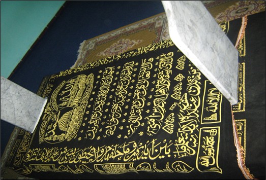 السجادة على القبر: رمز مكة المكرمة المتمثل بالمسجدين في الأعلى. كتب عليها