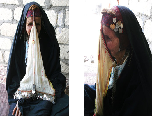 وفي منطقة الدراسة لم يستخدم البرقع إلا السيّدات كبار السن كما يظهر في الشكل (7، 8) الشكل القديم للبرقع والذي يحتوى على قطع معدنية من الفضة أسفل البرقع، أما في أعلى البرقع فتظهر القطع المعدنية على شكل عملات قديمة.