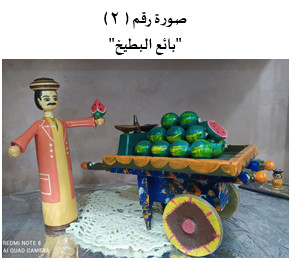 بائع البطيخ: اشتهر بائع البطيخ في الأسواق المصرية وخاصة في فصل الصيف؛ نظرًا لأن البطيخ من الفواكه الصيفية، واهتم الفنان في (صورة: 1) بأدق الموتيفات لبائع البطيخ، بدءًا من الزي وهو جلباب صعيدي بدون ياقة، وله فتحة صدر مثلثة وأكمام واسعة؛ كي يتمكن المزارع من تعليقه أو تشميره لمنع اتساخه، ويرتدي فوق الجلباب بالطو طويل؛ كنوع من الأناقة، وفوق رأسه الطاقية الفلاحي، ويحمل في يده قطعة من البطيخ يطلق عليه باللهجة الشعبية "شقة بطيخ"، وقد أبدع الرسام في رسم الميزان الذي له كفتان، كما أبدع في رسم عربة البطيخ مستعين بالعديد من الألوان المتناسقة بين (الأزرق والبني والأصفر والبرتقالي)، ومن المتعارف أن عربة بائع البطيخ يجُرها الحمار ويطلق عليها في الثقافة الشعبية (عربة كارو)، وقد تم تلوينه كما لو كانت صورة حية.