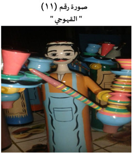 (صورة: 10)، وفي اليد اليسرى يحمل الشيشة، وهذه الموتيفات توضع في يد العرائس باستخدام اللاصق، مع استخدام الألوان المتناسقة مع الزي ما بين الأزرق الفاتح والابيض، والأصفر والبني والأزرق الفاتح، ويشتهر "القهوجي" بارتداء فوق الجلباب مريلة المطبخ الذي يوجد بها جيب لوضع النقود، وحاول الرسام رسمها وتلوينها بشكل يمنحنا الاحساس بوجودها منفصلة عن الجلباب.