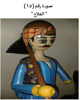الفلاح: هو المزارع الذي يقوم بزرع وحصاد الأرض الزراعية، ويمثّل الفئة الكادحة في القرى المصرية، وهو من صغار الملاك للأراضي الزراعية، وأحيانًا يعمل بالأجر في أرض العمدة أو أحد الملاك الكبار، وقد حاول الرسام تجسيد شخصية الفلاح في العرائس الخشبية(صورة: 14)، وقد أبدع في عمل فلاح له موتيفات مثل الفأس الذي يعمله بيده اليمنى من خلال عصا الفأس المعشقة في اليد، وفلاح له أدوات تم رسمها كجزء من الشخصية كالفأس الذي يحفر به في الأرض لوضع البذور، والمنجل الذي يقطع به الخضرة التي تم زراعتها، وكذلك رسم اليدين وعدم تجسدها، فقد نوع الرسام في تشكيل شخصية الفلاح، كما رسم المنديل الذي يوضع على رأس الفلا ح فوق الطقية والذي اشتهر به الفلاح المصري. والفلا ح في الغالب الأعم يرتدي جلبابا ويقوم برفع الجلباب إلى أعلى من خلال حزام من القماش حتى ييسر عليه العمل